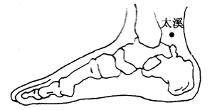 太溪:内踝后方.当内踝尖与跟腱之间的中点凹陷处。