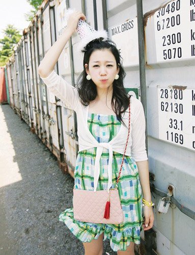 情景独白:给姐妹淘过生日,我先戴戴她的寿星帽玩玩。今天穿了绿条纹格子抹胸裙,配上白色针织衫。简单的搭配保持了我的可爱搞怪路线,却也不会抢寿星的风采!