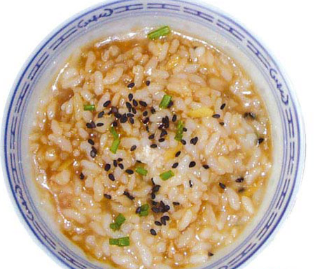 3.大米煮成粥后,将鸡肝糊加入,再放少许酱油和熟芝麻,搅匀即成。